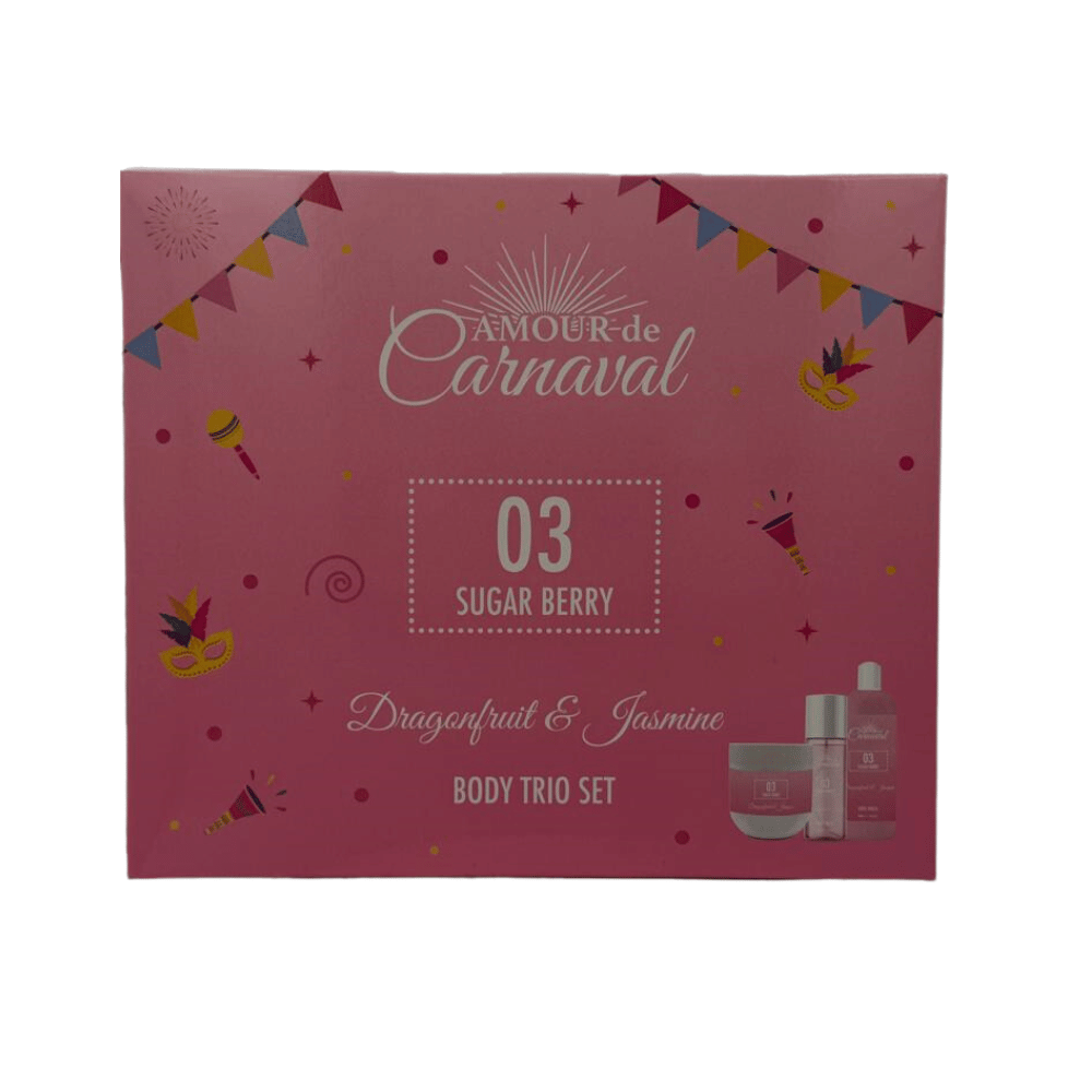 Experience the luxurious and nourishing benefits of Amour de Carnaval Body Trio Set - 03 Sugar Berry. This set includes a shower gel, body lotion, and body mist with the irresistible scents of dragonfruit and jasmine. Indulge in a sensory delight while providing your skin with essential hydration and moisture. With this set, you'll feel pampered and refreshed all day long.