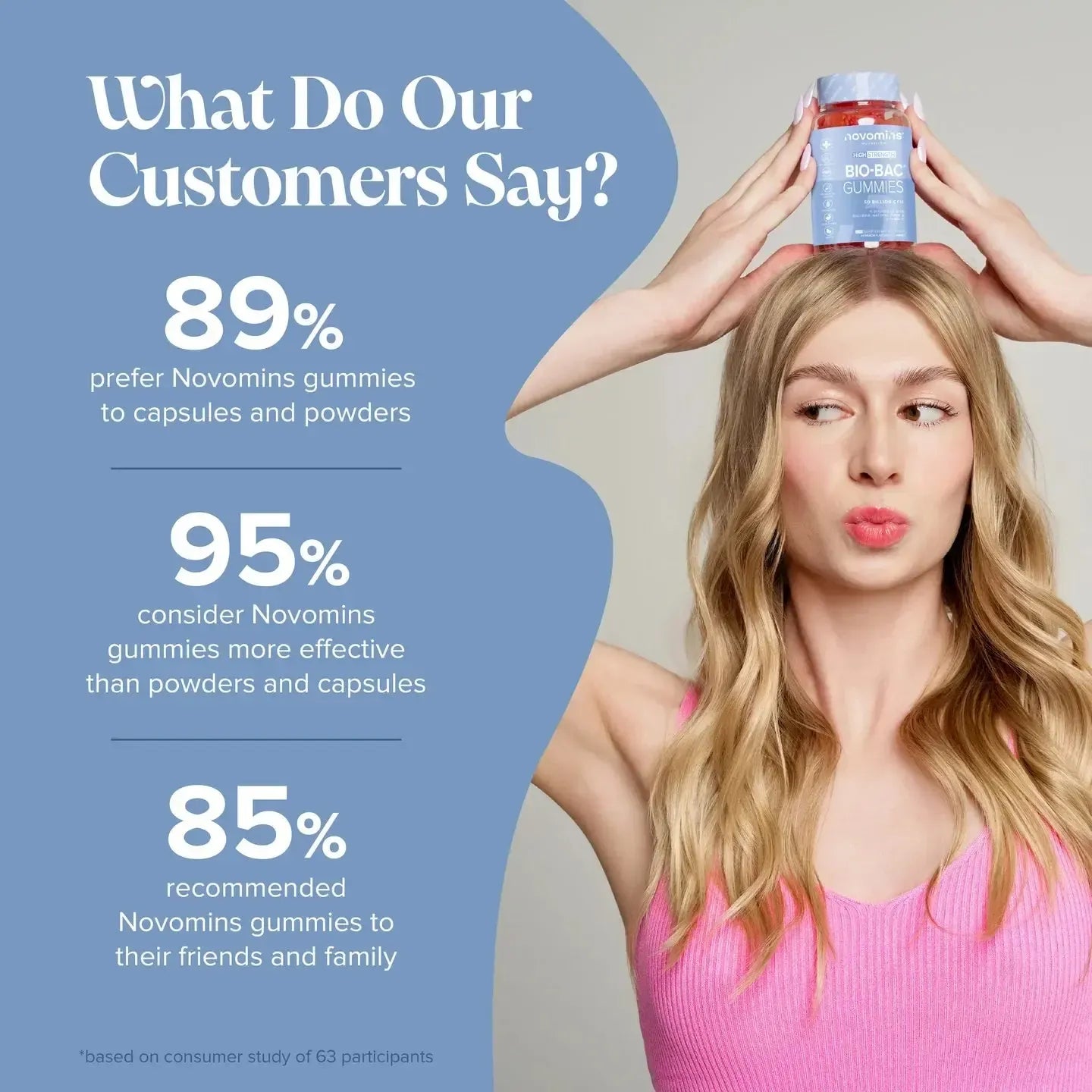 Novomins Bio-Bac Gummies – our world's first advanced live formula with 50 billion CFUs and 11 bacterial strains in each serving.