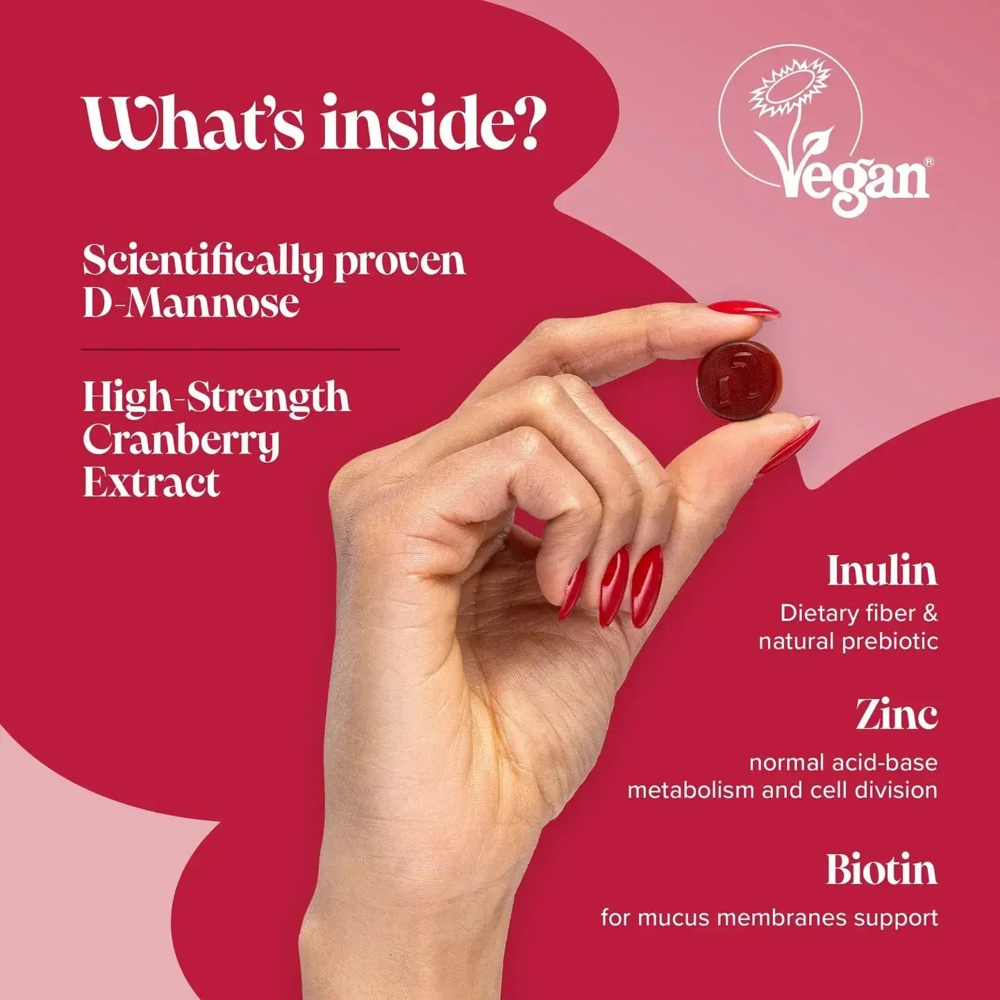 Expertly formulated for women, these delicious strawberry-flavoured gummies are infused with cranberry extract and D-Mannose, they are designed for those looking for a natural supplement. With added biotin and zinc, these gummies also contribute to the urinary tract health by contributing to mucous membranes.