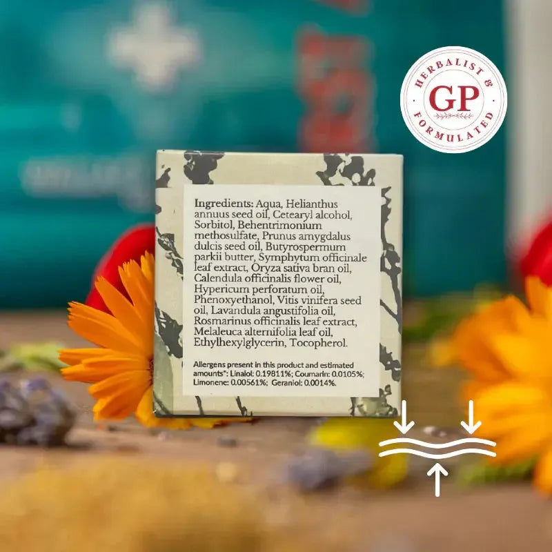 Aqua (Water), Sunflower Seed Oil (Helianthus annuus), Cetearyl Alcohol, Sorbitol, Behentrimonium Methosulfate, Sweet Almond Oil (Prunus amygdalus dulcis), Shea Butter (Butyrospermum parkii), Comfrey Leaf Extract (Symphytum officinale), Rice Bran Oil (Oryza sativa), Calendula Flower Oil (Calendula officinalis), St. John’s Wort Oil (Hypericum perforatum), Phenoxyethanol, Grape Seed Oil (Vitis vinifera), Lavender Oil (Lavandula angustifolia), Rosemary Leaf Extract (Rosmarinus officinalis), Tea Tree Leaf Oil (Melaleuca alternifolia), Ethylhexylglycerin, Tocopherol (Vitamin E).
