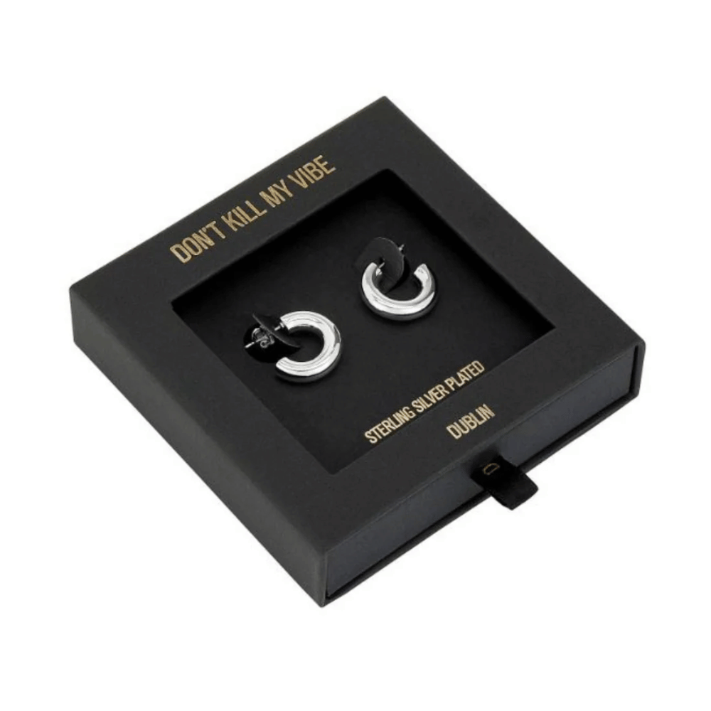 The Ery Day Mini Hoop Earrings in Silver are your go-to accessory for effortless, everyday glam. Crafted from 100% recycled solid brass and plated in sterling silver, these chunky mini hoops feature a bold 20mm width and 5mm thickness for a modern, statement look. Designed in Ireland and engraved with the signature DKMV mark, they blend sustainability with style, making them perfect for dressing up or down. Each pair comes with a cotton DKMV duster bag to keep your earrings safe, so you can shine with confidence wherever the day takes you.
