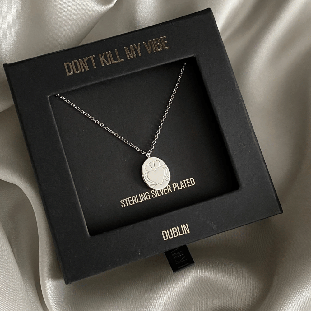 The Heart Strong Claddagh Necklace in Silver is a powerful tribute to Irish heritage with a bold, contemporary twist. Designed in Dublin by Ciara & Niamh of Don't Kill My Vibe, this necklace features a chunky paperclip-style chain and a custom Claddagh pendant measuring 33mm x 21mm x 2mm. It's crafted from 100% recycled solid brass and plated in sterling silver, with a 16-inch chain and 3-inch extension for versatile styling. Representing friendship (hands), love (heart), and loyalty (crown), this piece is perfect for layering or wearing solo. Each necklace arrives in a recyclable, plastic-free gift box with a cotton duster bag to keep your vibes strong and your jewelry safe.