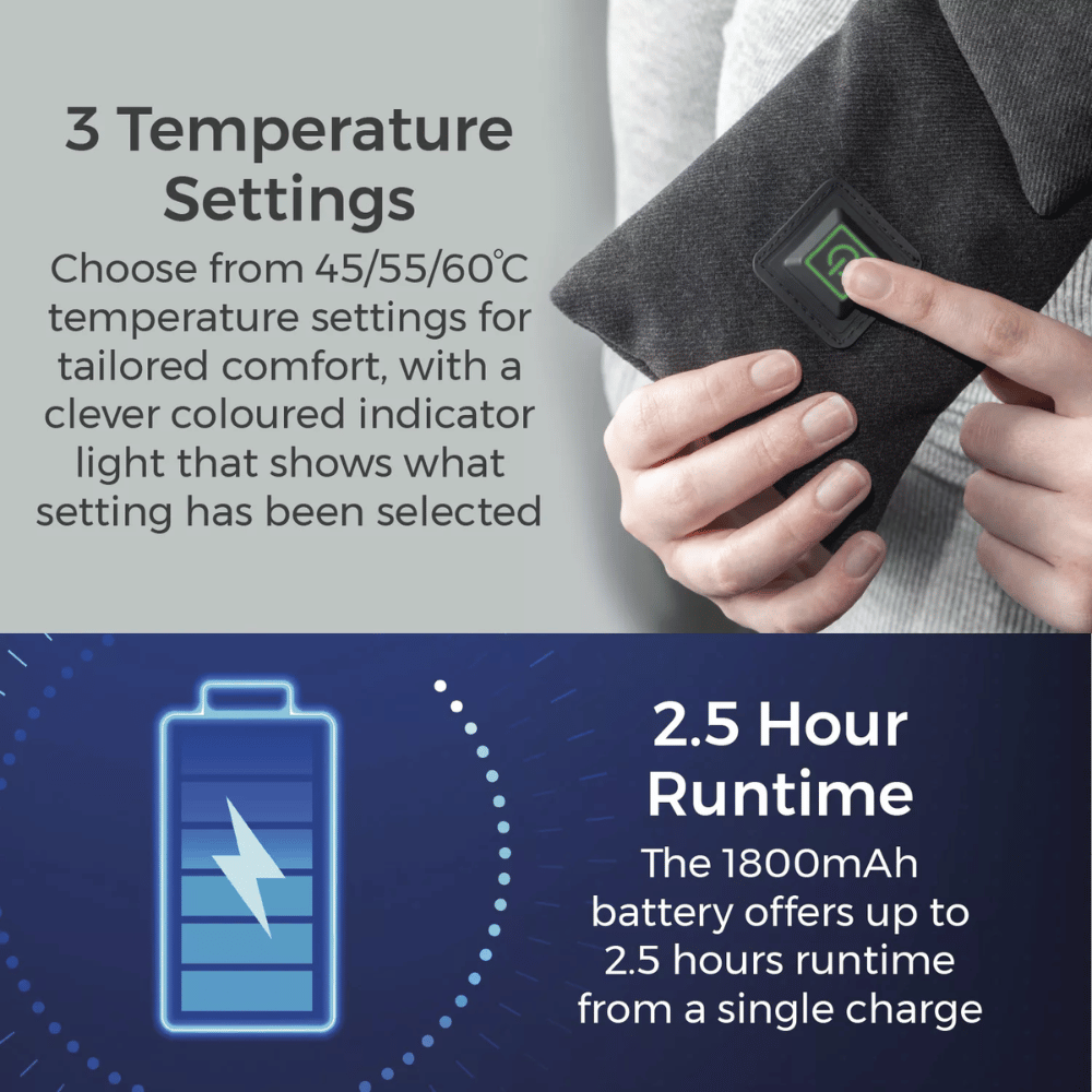 Equipped with a powerful 1800mAh battery, you can enjoy up to 2.5 hours of continuous heating & relief from a single charge