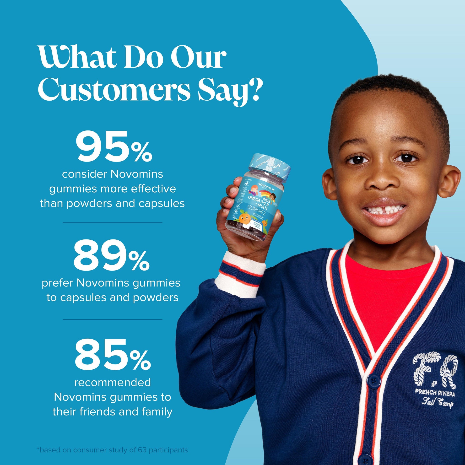 What is it? Novomins designed their Kids Omega 3-6-9 + Multi Gummies to be Vegan friendly and removed the fish by sourcing the Omega's from plants. This means Novomins gummies taste really delicious and they help your little one's meet their daily nutrient needs of essential fatty acids, which are important for growth and development.