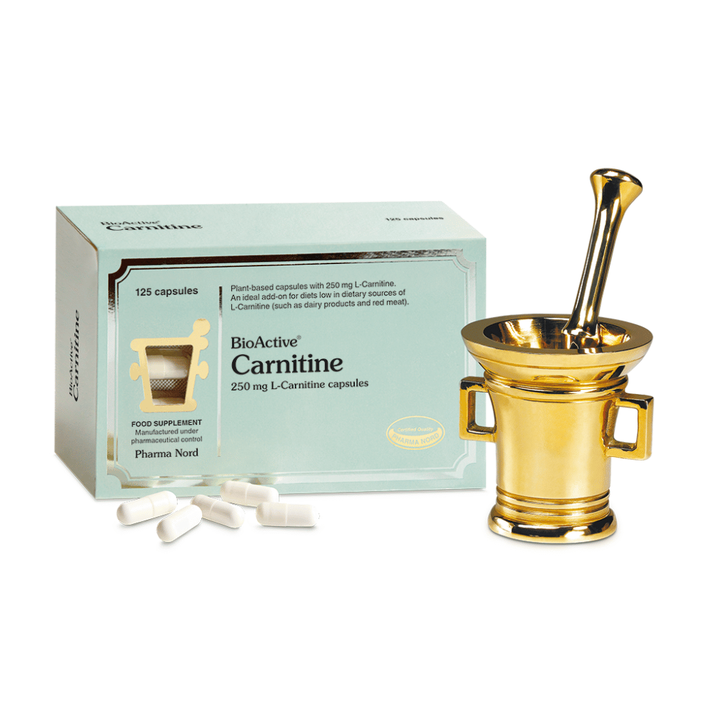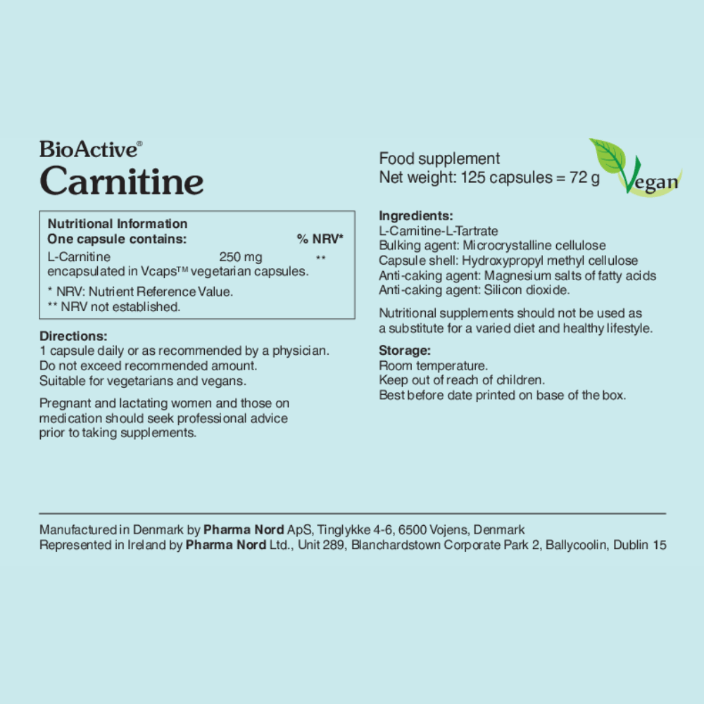 BioActive Carnitine contains vegetable capsules with 250 mg of the amino acid carnitine. The content in BioActive Carnitine is strictly vegetarian and produced by means of a unique manufacturing technique based on fermentation. This method that carries the 'Carnipure' quality stamp makes it possible to produce L-carnitine exactly like it is produced by nature. The result is pure, nature-identical L-carnitine without residues of D-carnitine.