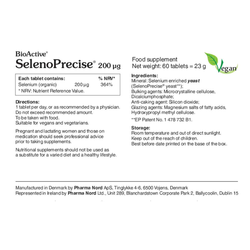 - Each tablet contains 200 µg of the well-documented and patented SelenoPrecise selenium yeast