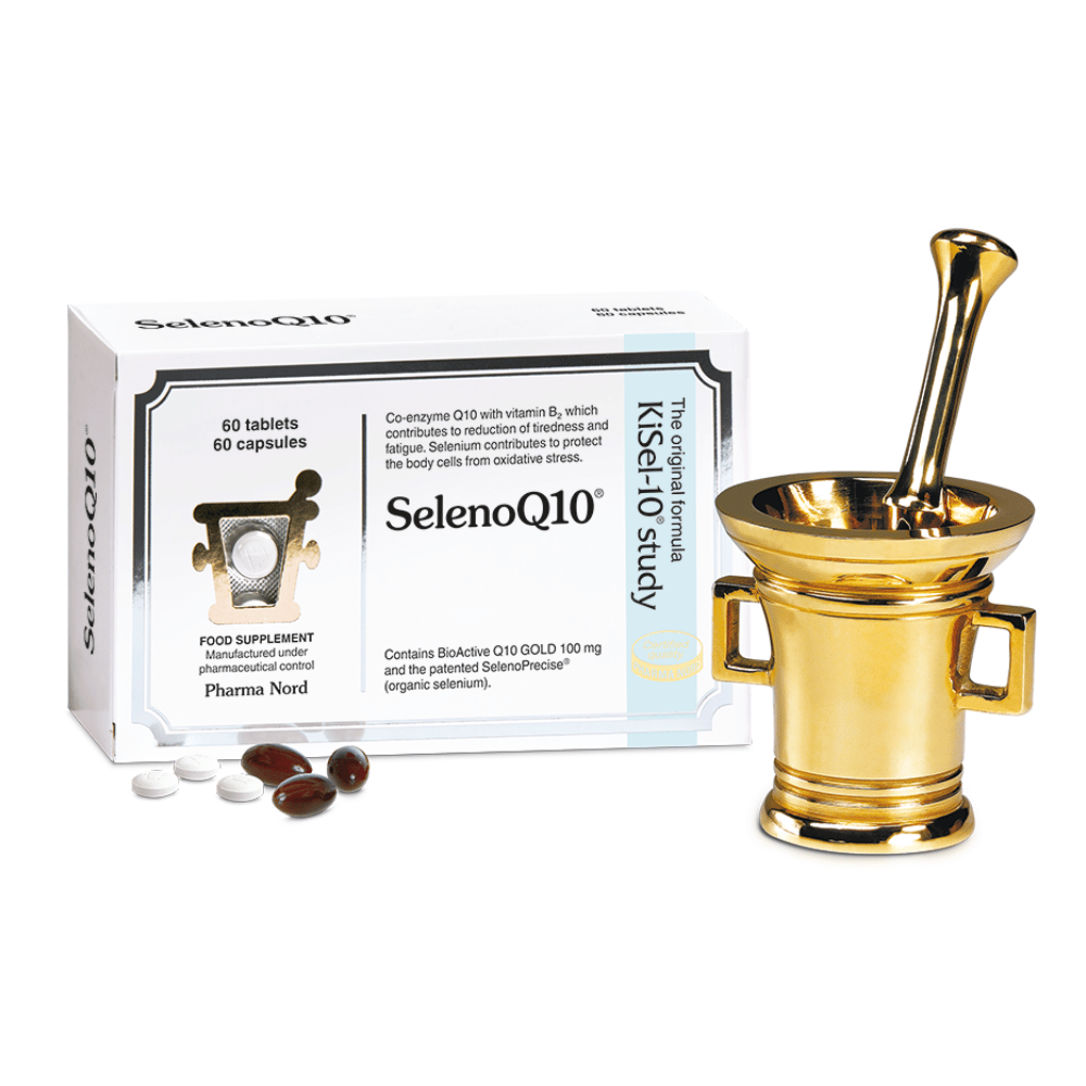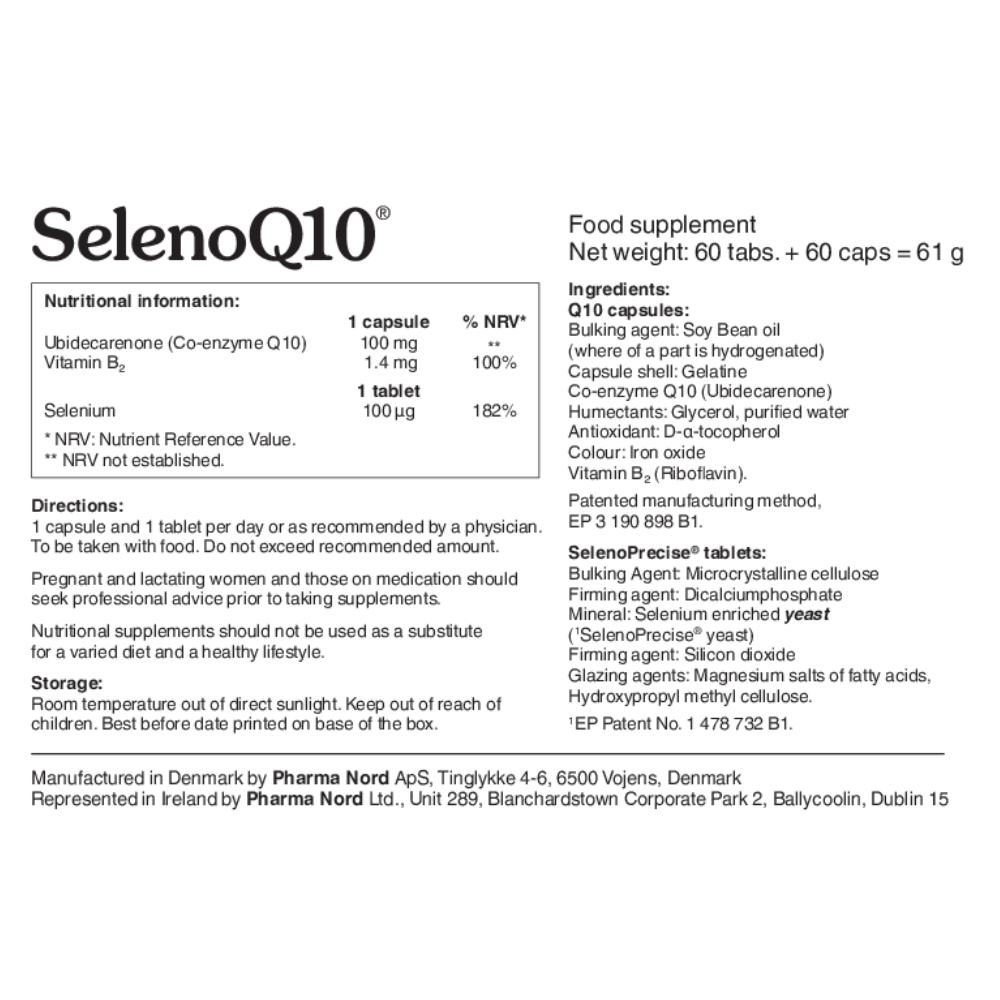 SelenoQ10 is a combination product consisting of soft gelatin capsules with 100 mg of Q10 in the form of ubiquinone and round, white tablets with 100 ug of selenium yeast (SelenoPrecise). SelenoQ10 is particularly suitable for middle-aged and elderly people.