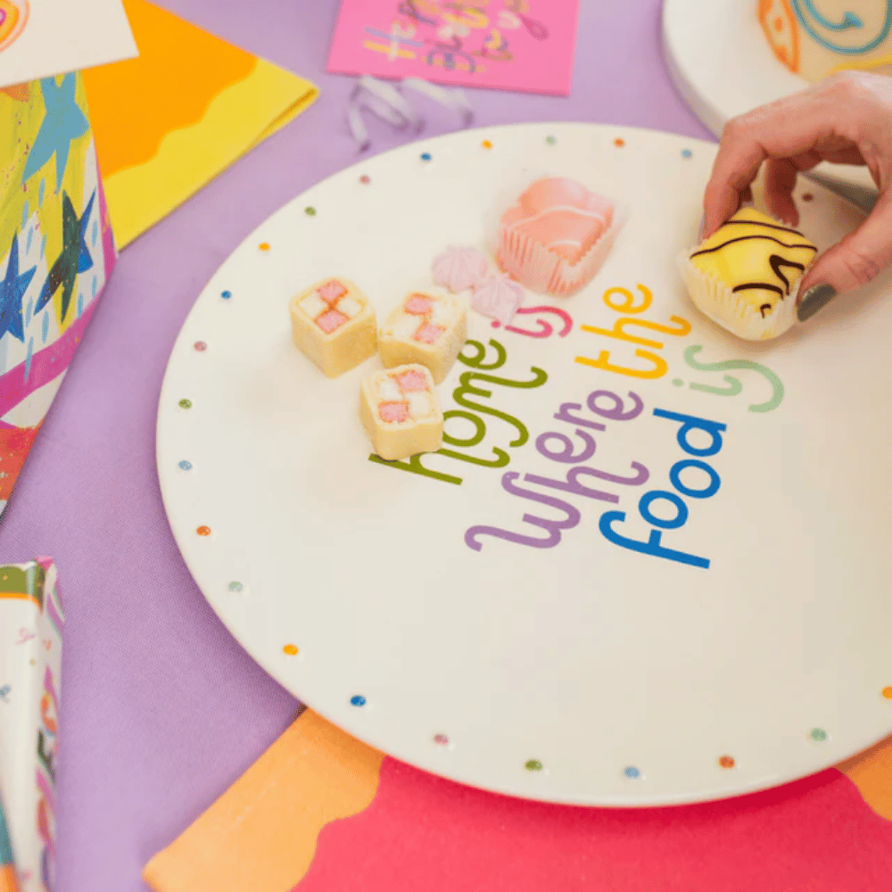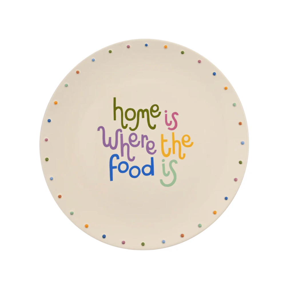Made from ceramic and white, it has brightly multicoloured dots around the edge. Finished with the wording, ‘Home is where the food is.’