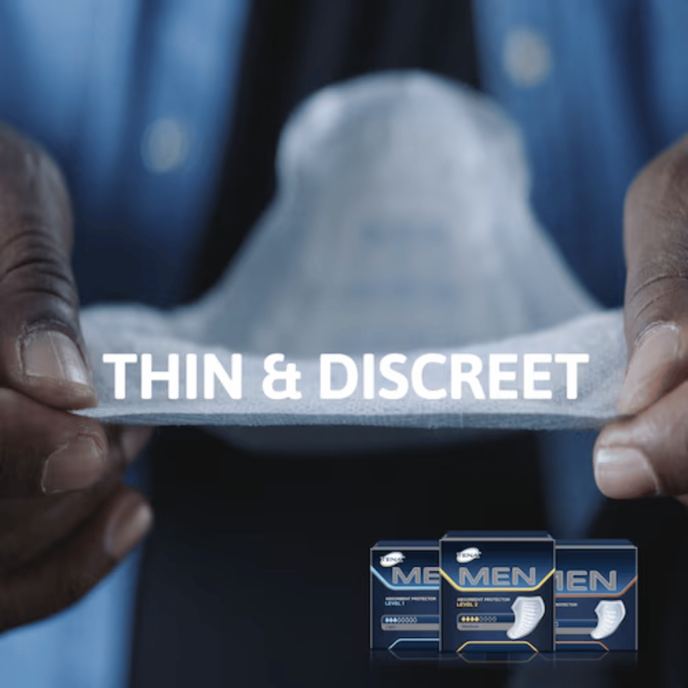 Millions of men of all ages use TENA Men Absorbent Protector Level 2 to stay in control and protect themselves against medium urine leakage. Its absorbent core with boosted Secure Absorption Zone for leakage security locks in odours and moisture. Now much thinner but still offering the same security, the protector’s masculine, cup-shaped design ensures it sits securely in the underwear – so securely, you might even forget it is there. Wherever you find yourself, enjoy confidence and peace of mind with TENA Men Absorbent Protector Level 2.