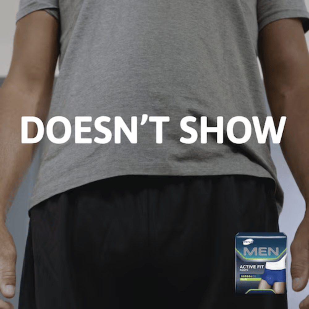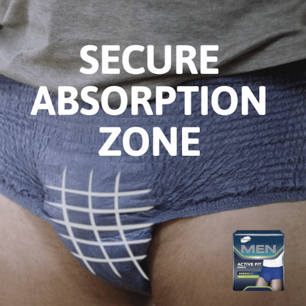 Keep an active lifestyle despite urine leaks with TENA Men Active Fit incontinence pants. This underwear-like incontinence pants have a navy blue color with masculine style and secure fit.