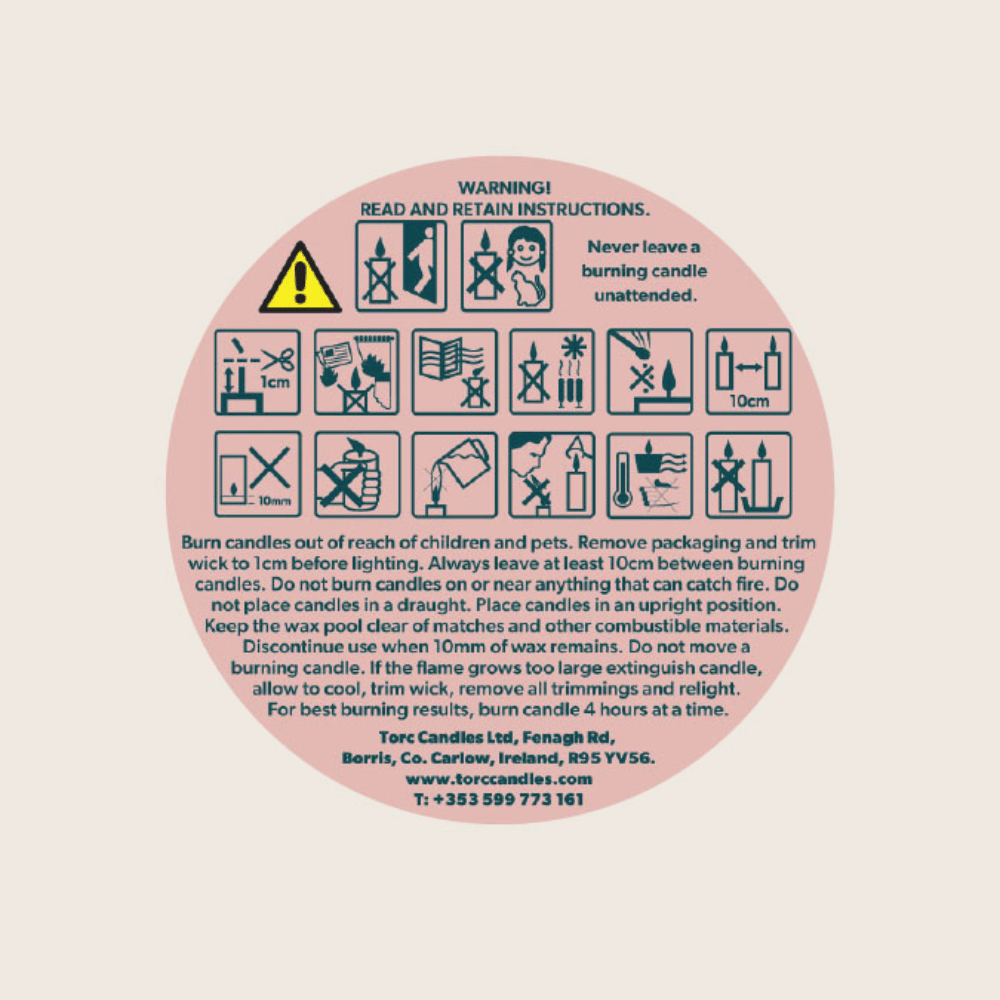 Keep out of reach of children, burn-in 4-hour intervals, trim the wick to 10mm, and keep upright on a heat-resistant surface. |